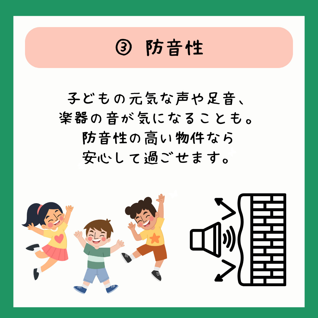 お子さまの元気な声や足音が気になる場合も、防音性が高い物件なら安心です